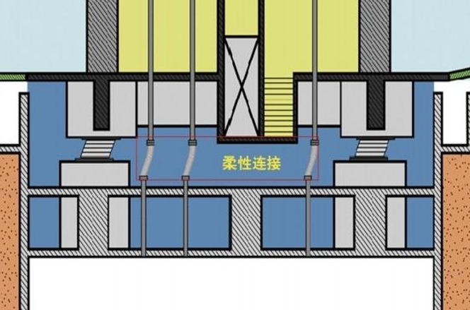 在地震中,隔震层会发生较大幅度的运动,因此所有穿过隔震层的设备管道必须满足隔震层的 上下错位要求。设备管道穿过隔震层时设置的能满足隔震层相应水平位移要求的柔性管材。